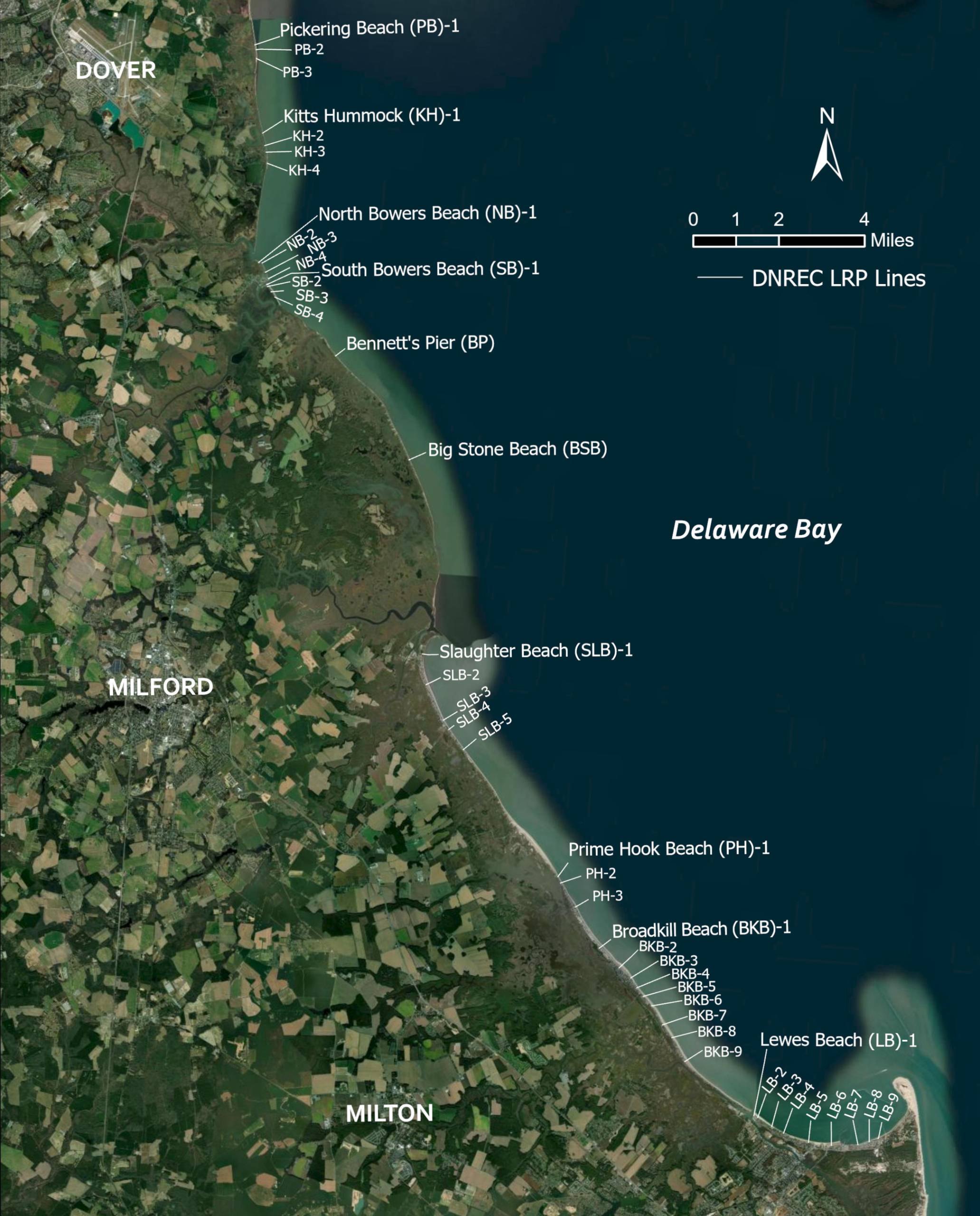 The Shoreline and Waterway Management Section surveys over 80 profiles along Delaware’s bay and ocean coast beaches twice each year to measure seasonal and annual beach change conditions.
