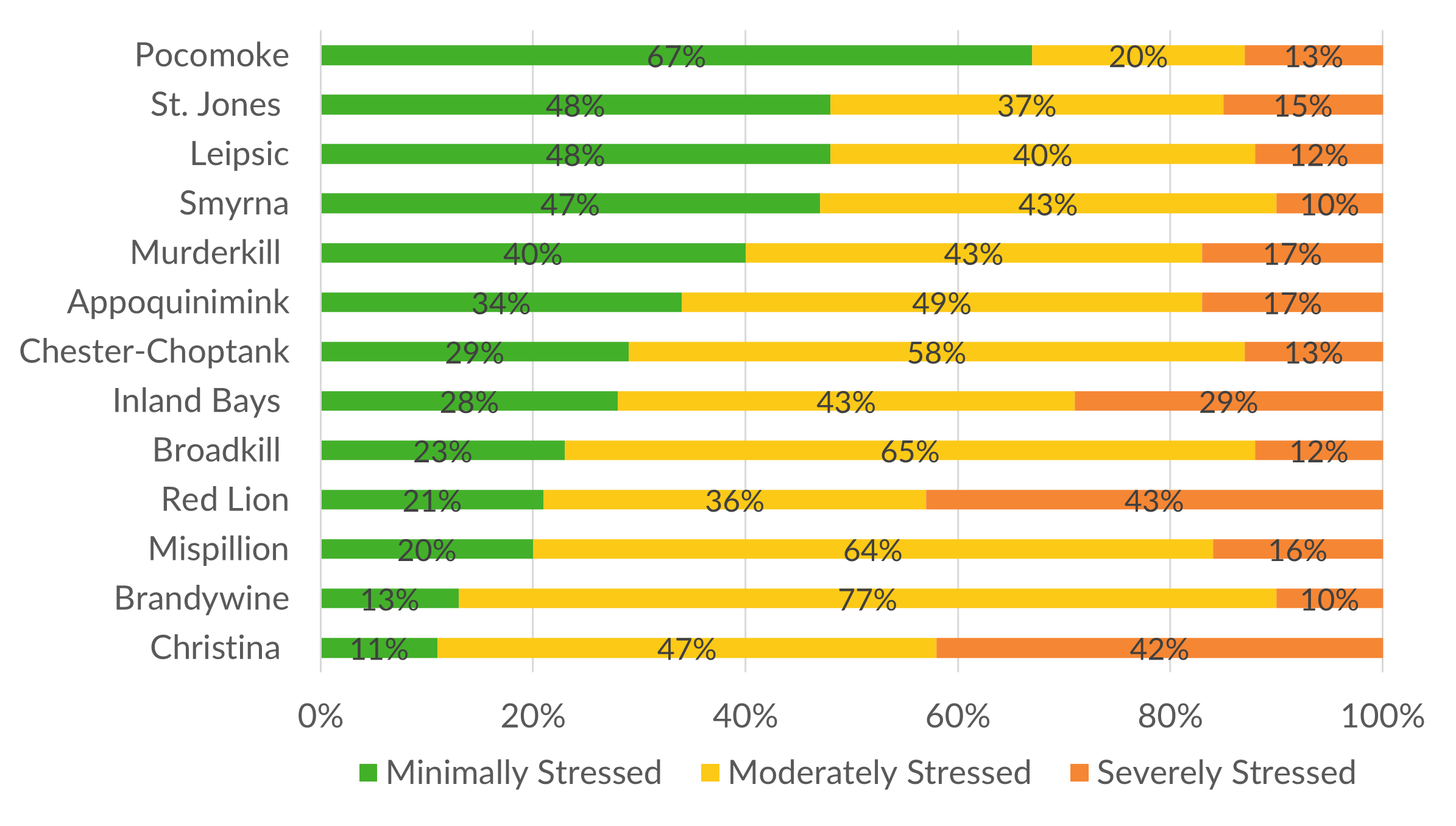 The bar graph displays the comparison of overall conditions for assessed watersheds throughout Delaware. Watersheds are listed in decreasing order of minimally stressed wetlands.